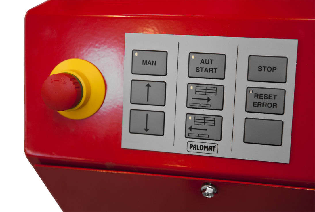- Palomat® Flexomatic arbeitet vollautomatisch. Es wird NUR manuell über das Bedienfeld bedient, wenn zwischen Stapeln und Entstapeln gewechselt wird.