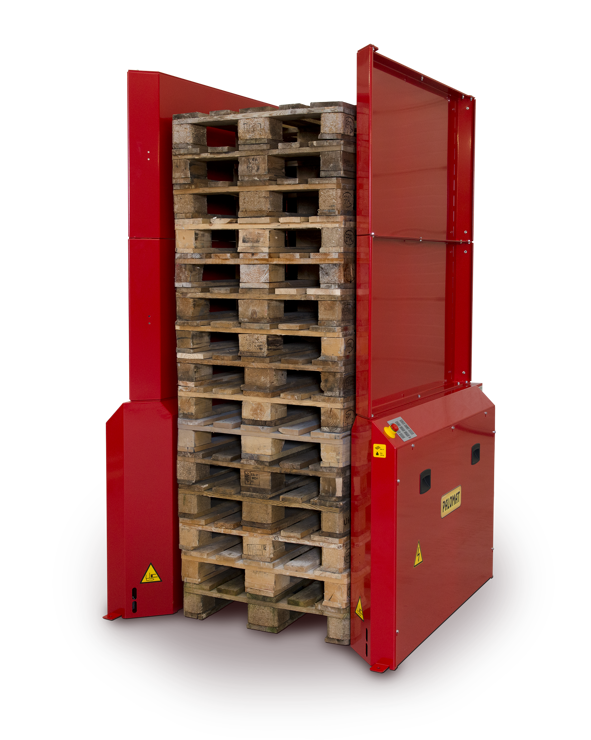Der PALOMAT Flexomatic ist für die automatische Stapelung und Entstapelung von Paletten konzipiert. Der Benutzer kann Paletten mithilfe eines Stapelwagens oder eines Gabelstaplers einsetzen oder entfernen, was alles auf Bodenebene durchgeführt werden kann. Der PALOMAT Flexomatic verwendet Fotosensoren, um die Paletten zu erkennen, die dann automatisch einzeln gestapelt oder entstapelt werden.