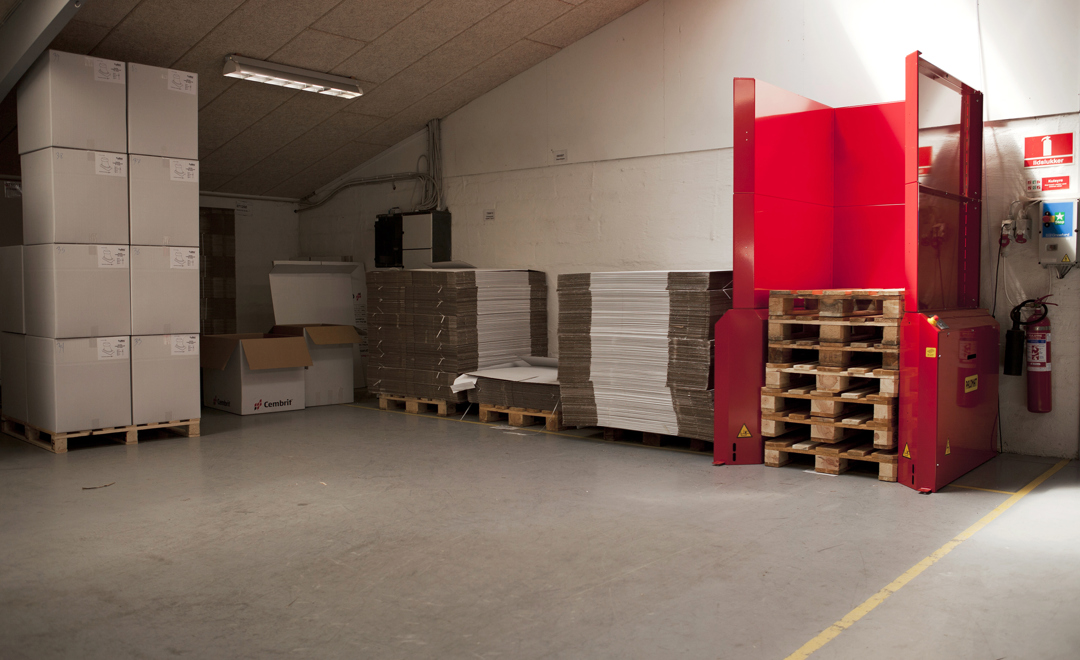 Bei der J.A. Plastindustri A/S werden jede Woche 100 EUR-Paletten hantiert. Der PALOMAT® ist in der Nähe der beiden Verpackungsförderer in der Verpackung angebracht. Von dort aus werden die Waren in Kartons verpackt. Eine leere Palette wird mit dem am PALOMATen befindlichen Hubwagen geholt und neben den Verpackungsförderer gestellt. Die Kartons vom Verpackungsförderband werden auf der Paletten gestapelt, woraufhin die gefüllte Palette zur Auslieferung transportiert wird. Hier wird erneut eine Paletten im PALOMATen geholt und der Durchfluss wiederholt sich. Wenn der PALOMAT® leer ist, wird er erneut mit Paletten vom Lager befüllt.