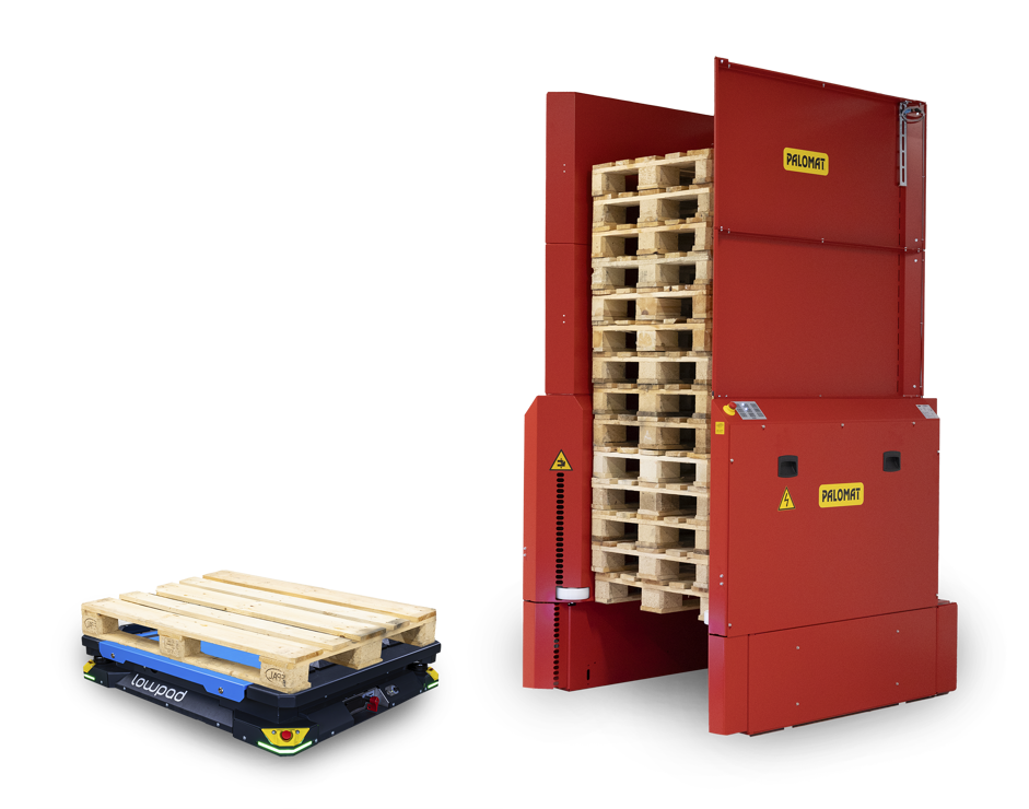 - Das Palettenmagazin stapelt und abstapelt automatisch die Paletten am Lowpad X, und fungiert als Palettenpuffer und Dockingstation dient und stets automatisch läuft.